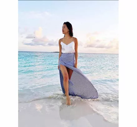 Η Nicole Warne είναι ασορτί με το τοπίο στις Μπαχάμες με μάξι φούστα και λευκό μεταξωτό top