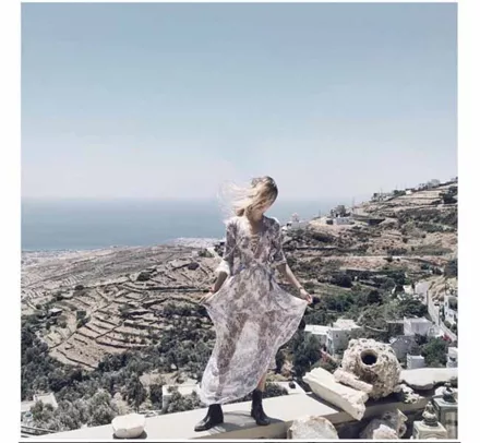 Η Sonya Esman επισκέφτηκε την ανεμοδαρμένη Τήνο και ντύθηκε στα χρώματα του νησιού με μάξι φλοράλ φόρεμα.