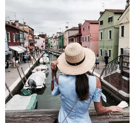 Ρομαντικό cold shoulder φόρεμα και ψάθινο καπέλο για την Krystal Bick στη Βενετία.