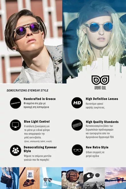 Σχεδιασμένα και κατασκευασμένα στην Ελλάδα, με Ευρωπαϊκές προδιαγραφές και από υψηλής ποιότητας Ιταλική πρώτη ύλη, τα Urban Owl ήδη ταξιδεύουν από τη Γαλλία μέχρι την Αμερική! Ένα από τα στοιχεία που τα κάνουν να ξεχωρίζουν ωστόσο είναι οι new retro επιρροές που συναντά κανείς στα σχέδιά τους, κάτι που τόσο πολύ ταιριάζει με τις πιο cool και νεανικές τάσεις της μόδας.