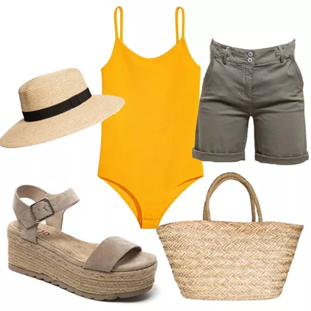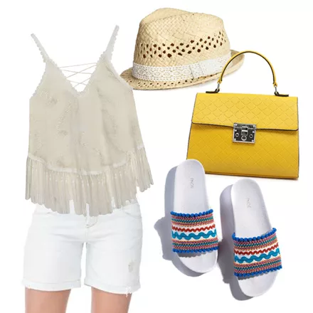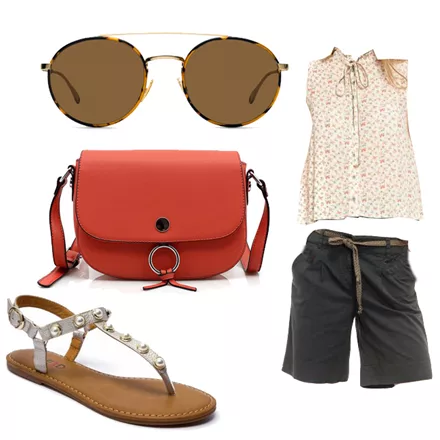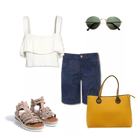 Τοπ, H&M, 19,99 ευρώ, hm.comΒερμούδα, BSB, από 49,90 τώρα 34,90 ευρώ, bsbfashion.comΓυαλιά ηλίου, H&M, 7,99 ευρώ, hm.comΣανδάλι, Helmi, helmi.grΤσάντα, Bozikis, 29,99 ευρώ, bozikis.gr