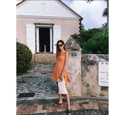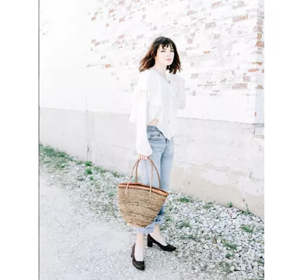 Μια ψάθινη τσάντα και ένα ζευγάρι παπούτσια με μέτριο τακούνι προσδιορίζουν το στυλ.