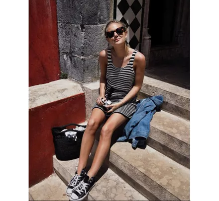 Ένα ριγέ πλεκτό φόρεμα είναι όσο 90s πρέπει και συνδυάζεται τέλεια με τζιν μπουφάν και all star!