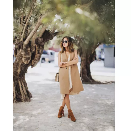 Tο μακρύ, αμάνικο γιλέκο σε καμηλό απόχρωση είναι το κομμάτι - «κλειδί» για ιδιαίτερο, χειμερινό layering. © Song of Style Instagram