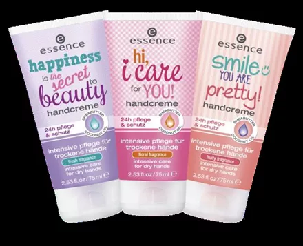 Οι τρεις κρέμες χεριών “happiness is the secret to beauty”, “hi, i care for you!” και “smile you are pretty!” της essence δίνουν μία αίσθηση περιποίησης για 24 ώρες και εξασφαλίζουν υπέροχα και απαλά χέρια. Τα τρία ευχάριστα αρώματα –φρέσκα, λουλουδένια και φρουτώδη- αποτελούν την ιδανική επιλογή για όλα τα γούστα. Το πλούσιο βούτυρο καριτέ και το πολύτιμο λάδι καρύδας φροντίζουν τα χέρια και τα ενυδατώνουν. Το προϊόν απορροφάται πολύ γρήγορα χωρίς να αφήνει ίχνη λιπαρότητας στο δέρμα.