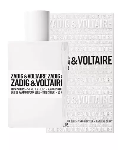 Το άρωμα Zadig & Voltaire This is HER! Είναι άσπρο, αληθινό, η παριζιάνικη φινέτσα τυλιγμένη σε αισθησιακό μετάξι και κασμίρ. Μία έντονη και ανήσυχη νέα γυναίκα αρωματισμένη από μυστηριώδες Αραβικό γιασεμί και πικάντικο ροζ πιπέρι. Μία rock νότα από κάστανό και βανίλια της δίνει γλύκα. Έκφραση ελευθερίας, θηλυκότητας και έντασης με βάση το άρωμα του σανταλόξυλου. Ανεξάρτητη, απρόβλεπτη, ακαταμάχητη. Θα το λατρέψεις!