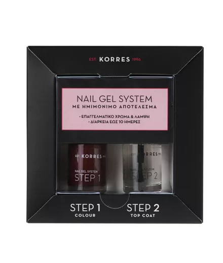Ούτε λάμπα ούτε ταλαιπωρία. Η ΚΟΡΡΕΣ παρουσιάζει το επαγγελματικών προδιαγραφών ημιμόνιμο manicure με το νέο limited edition Nail Gel System. Το χρώμα υψηλής απόδοσης «ενώνεται» με μοναδικό τρόπο με το εξειδικευμένο top coat - τα 2 βήματα του συστήματος - μεγιστοποιώντας την ένταση της απόχρωσης, τη λάμψη, τη διάρκεια του αποτελέσματος. Άψογο manicure που διαρκεί έως 10 ημέρες, ενώ τα νύχια παραμένουν υγιή, ενυδατωμένα, ελαστικά και ανθεκτικά.