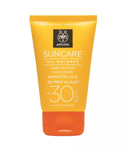 Το Face Cream Light Texture Oil Balance αντηλιακό της Apivita έχει ελαφριά υφή που δε βαραίνει την επιδερμίδα και προσφέρει ρύθμιση της λιπαρότητας και ματ όψη και παράλληλη προστασία από την UVA & UVB ακτινοβολία αλλά και τη φωτογήρανση. Τέλος, ενυδατώνει την επιδερμίδα αλλά και την τονώνει, καθώς περιέχει, υαλουρονικό οξύ και έγχυμα από τρία είδη βιολογικό τσάι του βουνού.