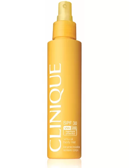 Το νέο Clinique SPF 30 Virtu-Oil Body Mist της Clinique προσφέρει την αίσθηση πολυτέλειας ενός ξηρού λαδιού σώματος συνδυασμένο με τη δερματολογικά ελεγμένη προστασία από τον ήλιο που χρειάζεσαι. Η τελευταίας τεχνολογίας, μη λιπαρή σύνθεση, του υγρού αυτού αντηλιακού παρέχει προστασία με αναλογία 3: 1 ενάντια στην ακτινοβολία UVB / UVA, απορροφάται αμέσως και δίνει μια εθιστική αίσθηση δροσιάς. Η εύκολη συσκευασία του σε μορφή σπρέι σημαίνει επίσης γρήγορη εφαρμογή, ακόμη και όταν η συσκευασία είναι γυρισμένη ανάποδα.