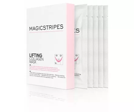 Magicstripes, Lifting Collagen Mask: Πρωτοποριακή μάσκα ανόρθωσης με κολλαγόνο που περιέχει συλλογή από ισχυρά ενεργά συστατικά. Η ειδικά σχεδιασμένη πλέξη και μίξη της μάσκας υποστηρίζουν το φυσικό V σχήμα της επιδερμίδας. Ανακουφίζει όλα τα συμπτώματα πρηξίματος στην χαμηλότερη περιοχή του προσώπου, είναι αποτελεσματικό ενάντια στο σχηματισμό διπλής σιαγώνας, ανασηκώνει το χαλαρωμένο δέρμα στα πλευρικά μάγουλα και στην γραμμή της κάτω σιαγώνας. Βρες την στο glowbox.gr
