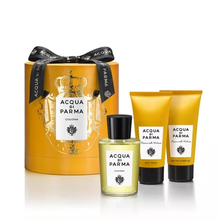 Ένα εκλεπτυσμένο σετ το οποίο αποτελείται από άρωμα (100ml), αφρόλουτρο (75ml) και κρέμα σώματος (75ml) της σειράς Colonia μέσα σε μια υπέροχη συσκευασία! Ένα κομψό κουτί, στο χαρακτηριστικό χρώμα της Acqua di Parma, το κίτρινο, στολισμένο στο μπροστινό μέρος με τον βασιλικό θυρεό σε χρυσή μεταξοτυπία και μαύρη κορδέλα από ταφτά και σατέν στην κορυφή, με τυπωμένο το Acqua di Parma σε χρυσή απόχρωση.