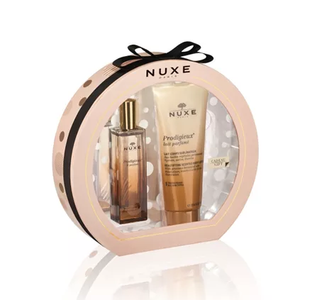 Το Πακέτο Parfum Prodigieux® είναι μια μοναδική "γυάλα" εμπνευσμένη από ένα μαγευτικό άρωμα! Για τις θαυμάστριες του Prodigieux le parfum® αυτό το πακέτο με την κομψή σατέν κορδέλα υπόσχεται να γίνει το τέλειο δώρο. Το χρώμα και το σχήμα του φέρνουν στον νου εικόνες από εορταστικά βράδια στο Παρίσι. Μέσα του κρύβει το αισθησιακό αποτύπωμα του αρώματος NUXE σε δύο πολύτιμες εκδοχές, το Prodigieux® le Parfum και το Αρωματικό Γαλάκτωμα Prodigieux®.