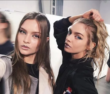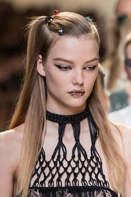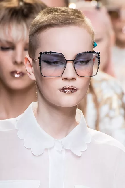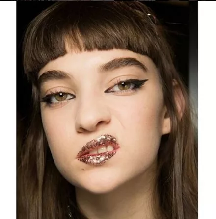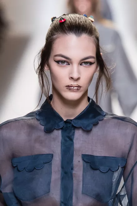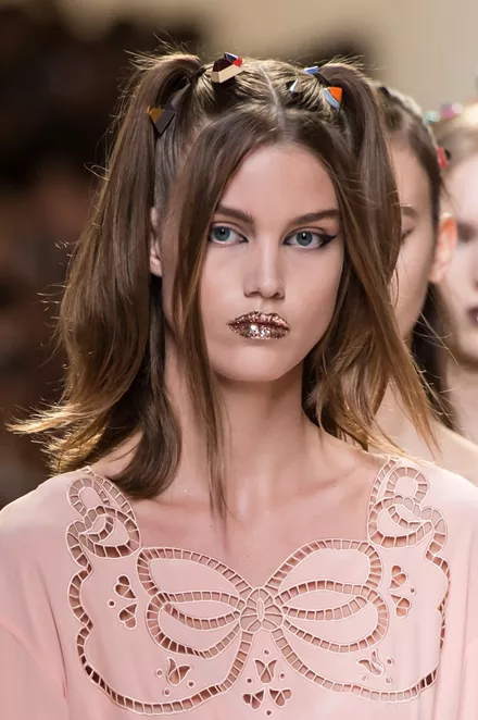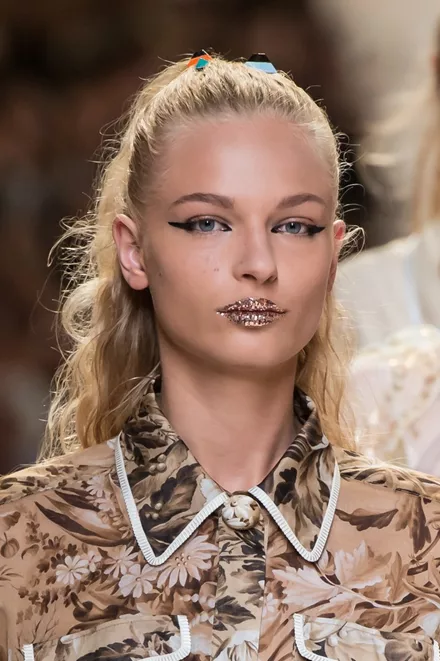 Συνδυασμένα με ένα edgy και πρωτότυπο μακιγιάζ στα μάτια, όπου η γραμμή του eyeliner κόβεται, αγκαλιάζοντας το μήκος του ματιού, ο makeup artist Peter Philips θέλησε να εκτοξεύει το look των μοντέλων με έντονο και sprarkly glitter στα χείλη: «Είναι σα να έχουν δαγκώσει ένα μεγάλο ντόταν γεμάτο με glitter» σχολίασε ο ίδιος.