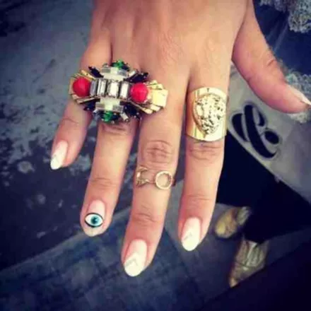 Η νέα εκδοχή στα σχέδια των νυχιών συνδυάζεται άψογα με τα glam αξεσουάρ και τα εντυπωσιακά δαχτυλίδια.