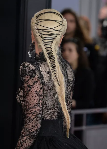 Οι δυο πλεξίδες ψαροκόκκαλο που ξεκινούσαν από τις δύο πλάγιες πλευρές του κεφαλιού της ενώνοντας σε μία από τον σβέρκο της και κάτω αλλά και σε όλη την πίσω επιφάνεια, με ένα λεπτό κορδόνι που θύμιζε δέσιμο γυναικείου κορσέ.