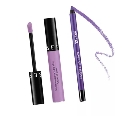 Μολύβι ματιών Aqua XL #Ι-90 Violet Pop Irisé, Make Up For Ever και υγρό Rouge velouté sans transfert #20 White Iris, Made in Sephora