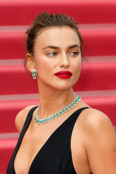 Το κόκκινο κραγιόν κάνει την τέλεια αντίθεση με τα σμαραγδί κοσμήματα, όπως αποδεικνύει και η Irina Shayk