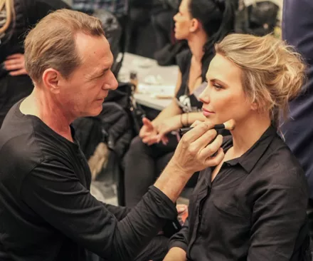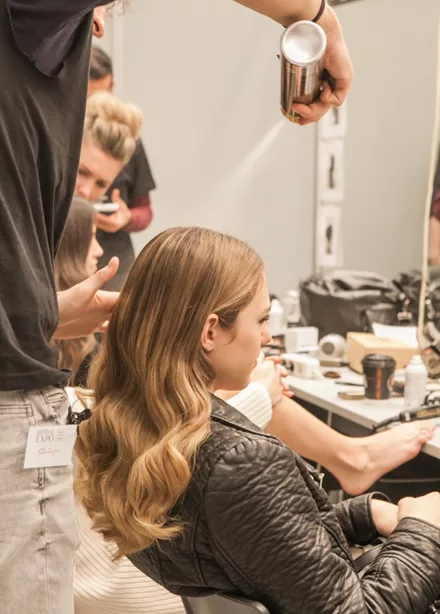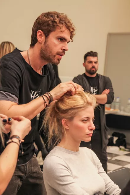 O Σταμάτης Καραΐσκος προσθέτει λίγη λακ Infinium, λίγο πριν την τελική εμφάνιση των μοντέλων στο catwalk