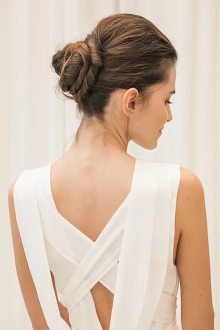 «Τα νυφικά συνόδευσε ένα οργανικό ακατέργαστο σινιόν με όλες τις φύτρες να πλαισιώνουν το πρόσωπο. Ένα hair look που πετυχαίνει μια αντίθεση αν συνδυαστεί με ένα πλουμιστό νυφικό» δήλωσε ο Σταμάτης Καραΐσκος