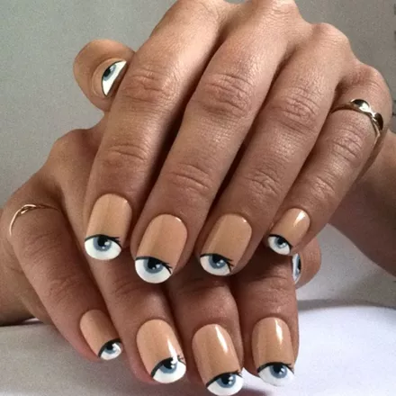 Ο ιδανικός συνδυασμός είναι: μπεζ βάση και σχεδιασμένο στη μήτρα του νυχιού ένα μάτι με λευκό και γαλάζιο χρώμα