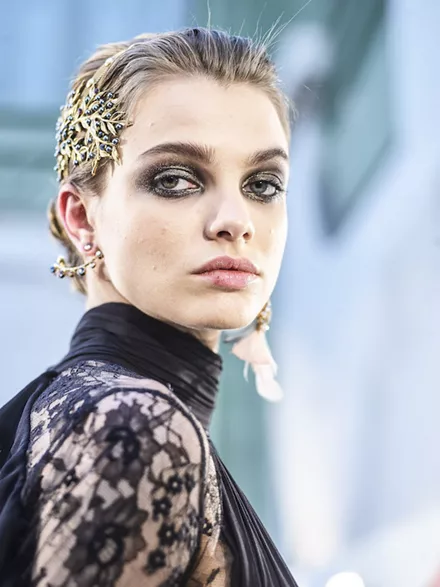Elie SaabΈνα mix παραμυθιού και γυναικείας δυναμικής σε ένα άκρως εντυπωσιακό και σκοτεινό eye look με πολύ glitter.