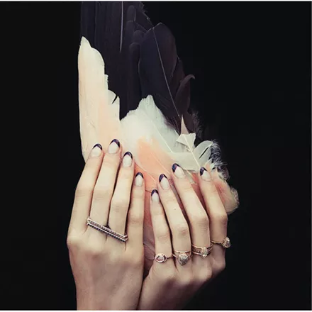 Η εναλλακτική version του γαλλικού μανικιούρ ανανεώνεται όταν συνοδεύεται από μοντέρνα αξεσουάρ, όπως ένα διπλό δαχτυλίδι.