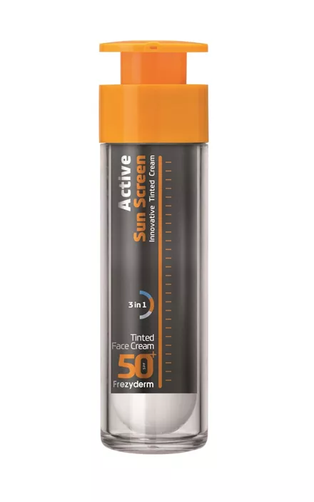 Η FREZYDERM σχεδίασε την σειρά ηλιοπροστασίας Active Sun Screen που ξεπερνά τα όρια της φροντίδας, αφού πέρα από ολοκληρωμένη ηλιοπροστασία προσφέρει στην επιδερμίδα Ενυδατική και Αντιγηραντική δράση, συνδυάζοντας 3 ενεργές φόρμουλες σε 1 μόνο προϊόν! Το ACTIVE SUN SCREEN TINTED FACE CREAM SPF 50+ προσφέρει ελαφριά κάλυψη και χρωματική ομοιογένεια. Με λεπτόρρευστη, μη-λιπαρή, υφή που αφήνει δροσερή αίσθηση στην επιδερμίδα.
