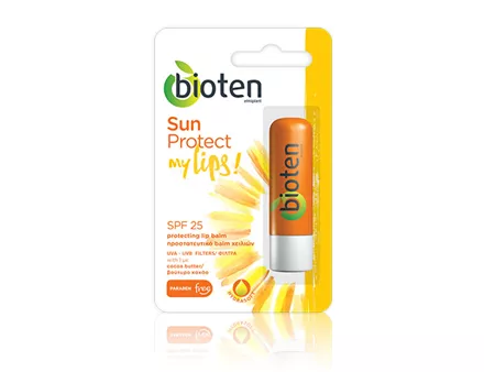 Το προστατευτικό balm χειλιών bioten Sun | Protect my lips! με SPF25 είναι εμπλουτισμένο με βούτυρο κακάο και βιταμίνη Ε, προστατεύοντας αποτελεσματικά τα χείλη από τις UVA/UVB ακτινοβολίες, ενώ προσφέρει αποτελεσματική ενυδάτωση στα ξηρά/ταλαιπωρημένα χείλη