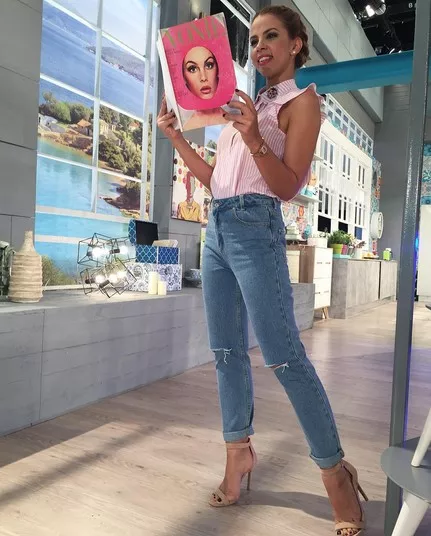 Ο τρόπος να μετατρέψεις το τζιν σου στο απόλυτο ανοιξιάτικο κομμάτι είναι να το συνδυάσεις με ένα τοπ σε έντονο χρώμα και με ένα ζευγάρι πέδιλα, όπως η Τζένη Μελιτά