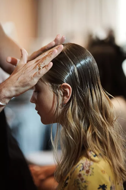 Για να ολοκληρωθεί το girly look στα μαλλιά προστέθηκε μια κορδέλα, και ολοκληρώθηκε το φινίρισμα του look με το Dry Conditioner Instant Energy, προϊόν που δίνει γυαλάδα και λείανση στα μαλλιά. Ένα wet undone look δημιουργήθηκε στα υπόλοιπα κορίτσια προετοιμάζοντας τα μαλλιά τους με το έλαιο της σειράς Solar του System Professional, βρέχοντας τα και ολοκληρώνοντας το edgy wet look με το Platinum Fix gel του System Professional.