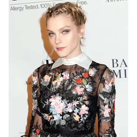 H Jessica Stam χώρισε τα μαλλιά της στη μέση και έκανε «εξωτερικές» γαλλικές πλεξίδες, οι οποίες κατέληξαν στο πίσω μέρος του κεφαλιού, δεμένες σε ένα χαλαρό σινιόν.