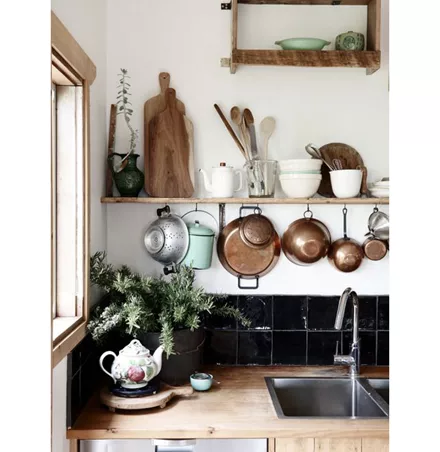 Παλιά μπακιρένια σκεύη και αντικέ χρηστικά μικροαντικείμενα δίνουν ενδιαφέρουσα υφή και ζεστασιά στον χώρο.