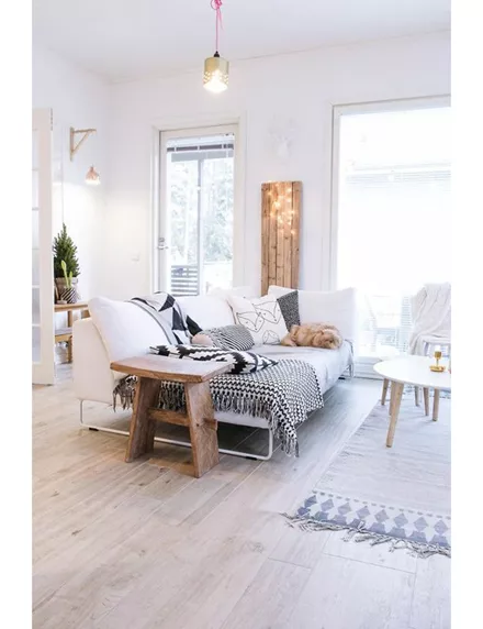 Μην φοβηθείς να μπλέξεις τις υφές στα υφάσματα: βαμβάκι, λινό, γούνα, μαλλί, μετάξι και βελούδο, μπορούν όλα να συνυπάρχουν σε ένα, κατά βάσει λευκό, "hygge" περιβάλλον.