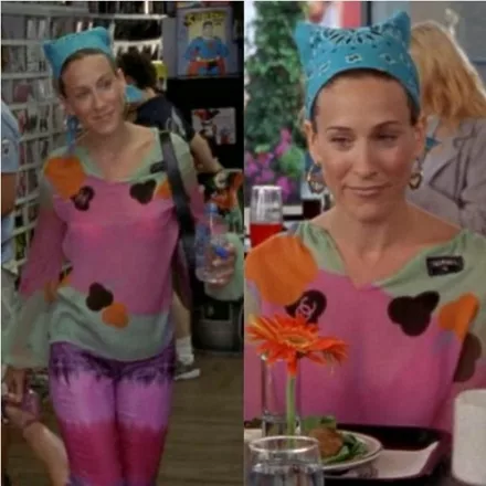 Αυτό το outfit δεν θα βρισκόταν στη λίστα αυτή αν η Carrie είχε επιλέξει να φορέσει ένα ουδέτερο παντελόνι με την συγκεκριμένη μπλούζα, χωρίς την μπαντάνα. Ο συνδυασμός όμως όλων αυτών των έντονων χρωμάτων με τα συγκεκριμένα prints και patterns, μας κάνει να απορούμε που όλη Νέα Υόρκη την αποκαλούσε μία από τις πιο στυλάτες γυναίκες της πόλης.
